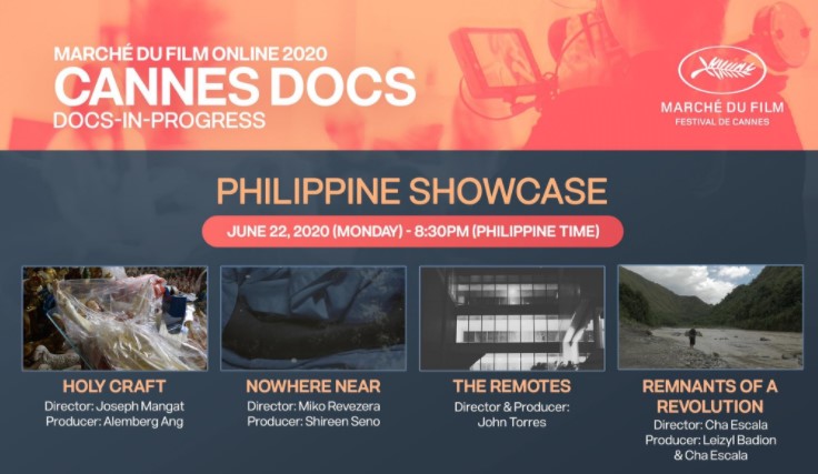 This year, four films from the Philippines will be showcased at Marche du Film by the Film Development Council of the Philippines at the Cannes Docs Online 2020. As one of FDCP’s focus this year is on empowering Filipino documentary films and providing filmmakers and producers more platforms, the Agency partnered with Cannes Docs Online 2020 to hold “Showcase Philippines” on June 22 as one of the eight showcases. Under the Philippines, the documentaries Holy Craft (dir. Joseph Mangat), Nowhere Near (dir. Miko Revereza), Remnants of a Revolution (dir. Cha Escala), and The Remotes (dir. John Torres) will be presented through a pitch and a 10-minute sequence of the rough cut. Each film screened will have the opportunity to win various prizes including the €10,000 Docs-in-Progress Award, supported by IEFTA.